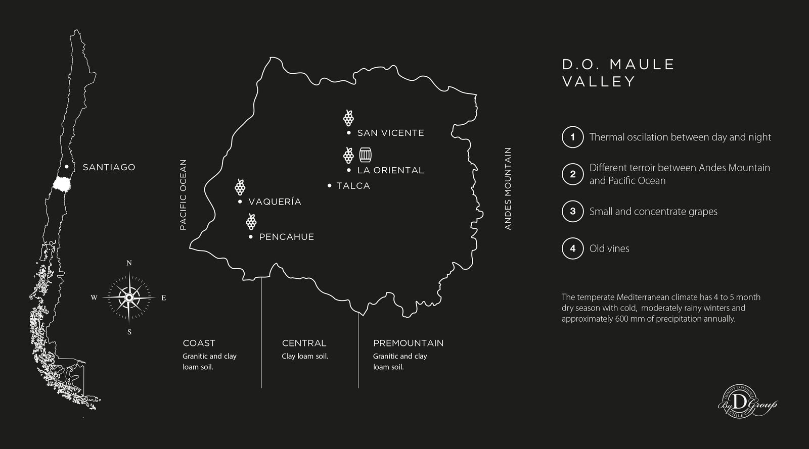 Donoso group posee cuatro viñedos ubicados dentro del valle del Maule. Este último es considerado la cuna de la tradición vitivinícola campesina y es actualmente el valle con más hectáreas plantadas en Chile.